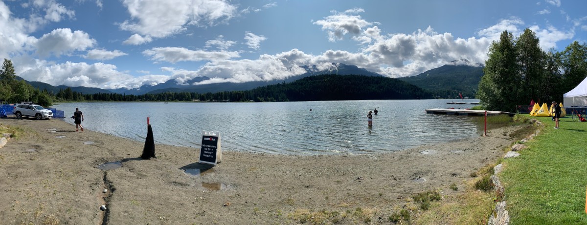 Friday was just a relax day. My family did a horse riding trip while I watched a movie in the car (horse riding hurts my knees, don’t ask me why!) Saturday was bike and gear drop off. The T1 was at Rainbow Park and you had two options. The first was to head over to T2 (a parking lot near the IRONMAN village and basically in the village) and drop off run gear then get a shuttle to T2 with your bike and bike gear OR they had labelled a trail from Whistler village to Rainbow Park. It was about 2.5 miles which is what I did. I rode the bike there using the backpack they provided to carry the gear along the paved trail, dropped off bike and bike gear bag then walked back. It was a nice little ride and walk. The walk back took about 45 minutes which really wasn’t bad. I then grabbed the family and the run bag, had lunch then dropped the run bag at T2.
